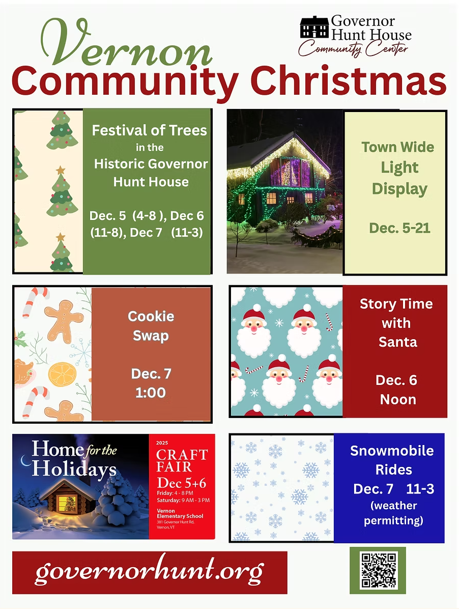 Celebrate the holidays in Vernon, VT. Festivities will include their Festival of Trees in the Historic Governor Hunt House, the Home for the Holidays Craft Fair, Snowmobile Rides, Cookie Swaps, and more!